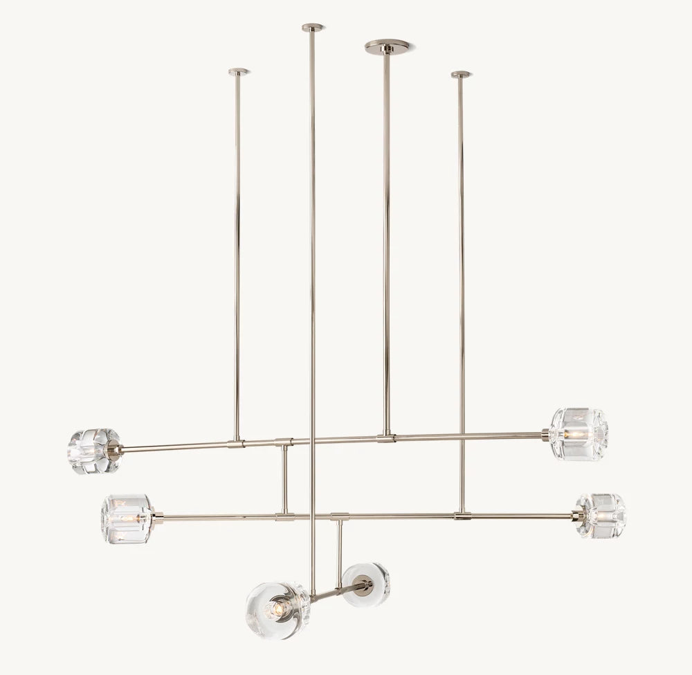 The chandelier is suspended by adjustable rods, designed specifically for flat ceilings, allowing for customized installation height. Its unique geometric form complements modern and transitional décors, providing a striking focal point in dining rooms, entryways, or spacious living areas.