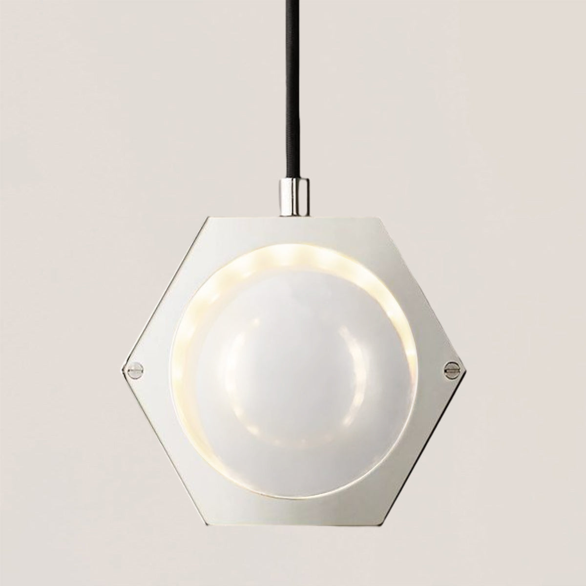 The collection features lighted crystal orbs, suspended in hexagonal fittings within a flat metal frame. The design was inspired by plans for the cenotaph of Sir Isaac Newton drawn by 18th-century architect Etienne Louis Boulle, a visionary ode to physics reinterpreted in a stunning contemporary form.