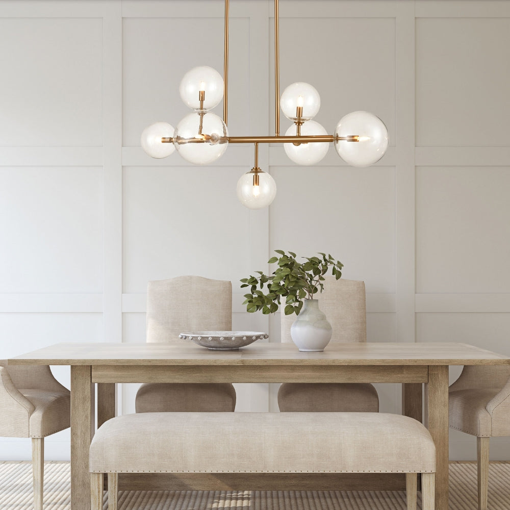 The Linear Chandelier brings a geometric vibe to a variety of interior spaces with its combination of classic shapes. Strategically placed globes of Clear glass rest on the ends of perpendicular bars to house the light bulbs for an elegant but playful expression.