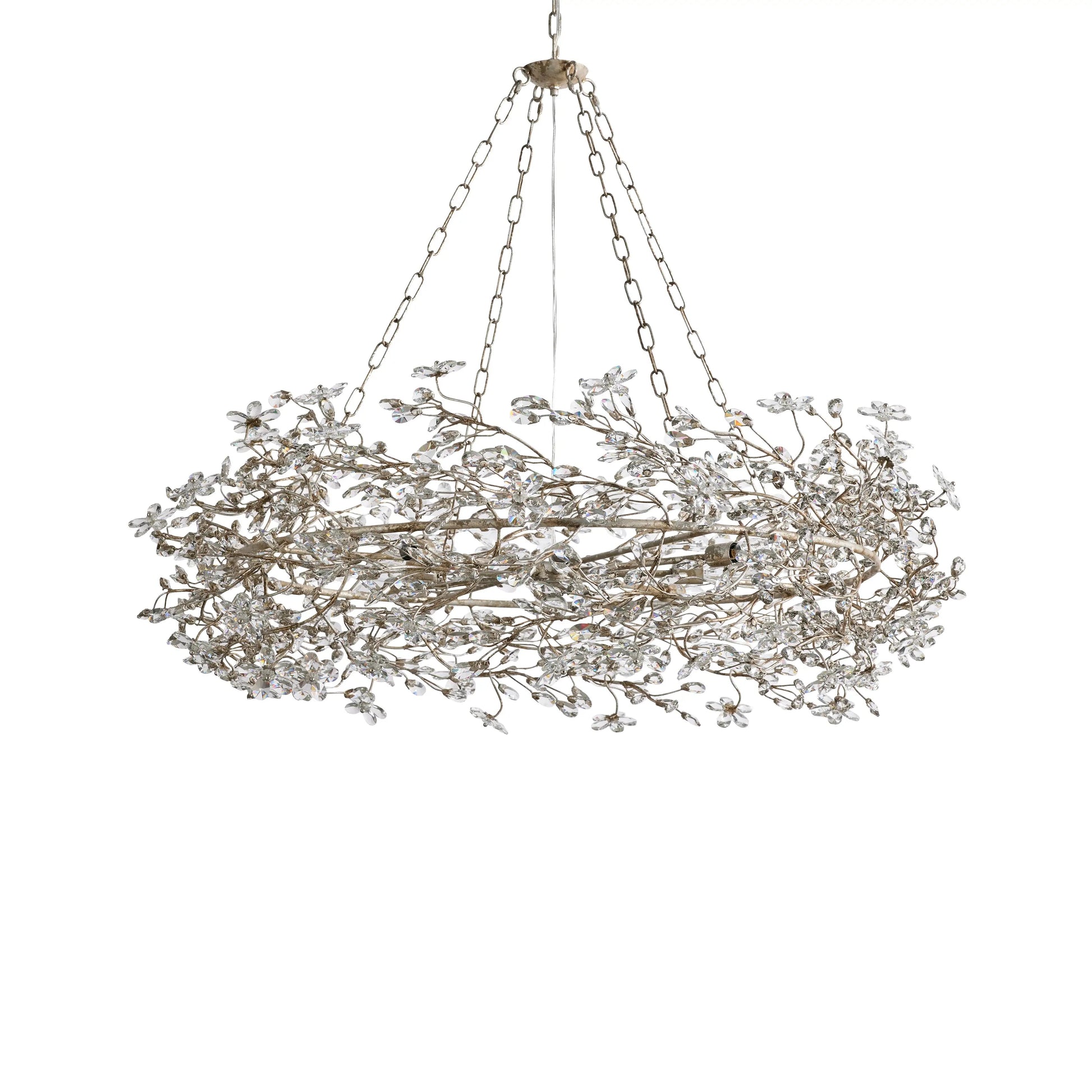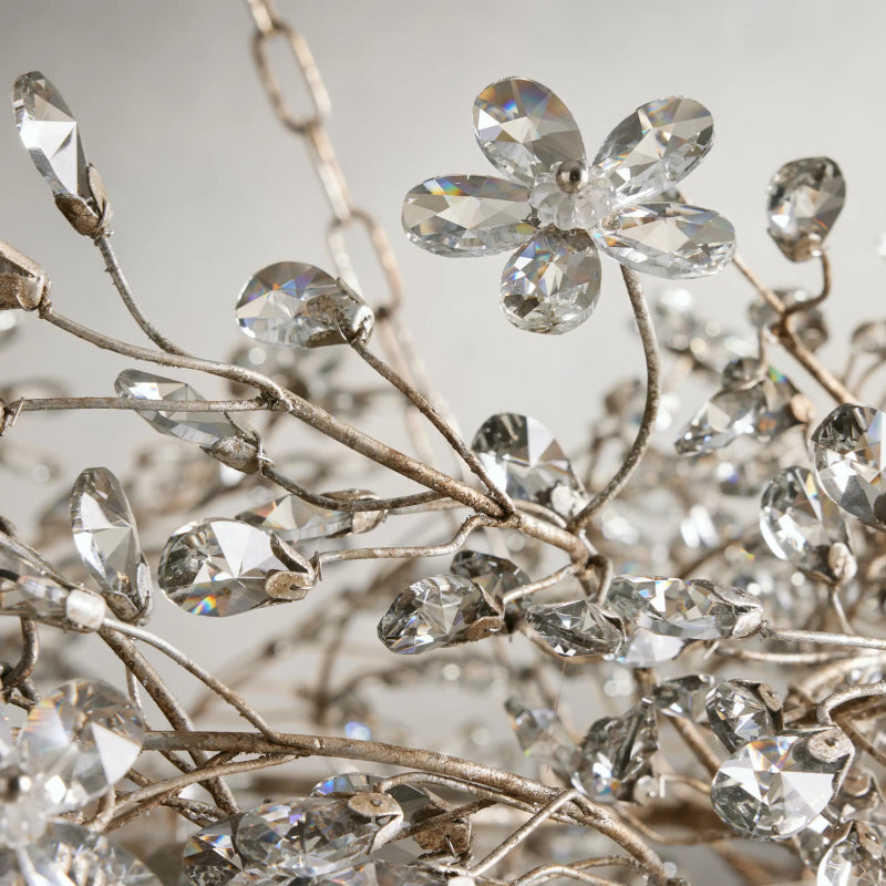 Luxurious crystal florals and drops illuminate each branch-like form of this elegant chandelier. Inspired by the beauty of nature, each piece is handcrafted by artisan partners using solid iron, hand-finished in silver, gold, or bronze to highlight refined craftsmanship.
