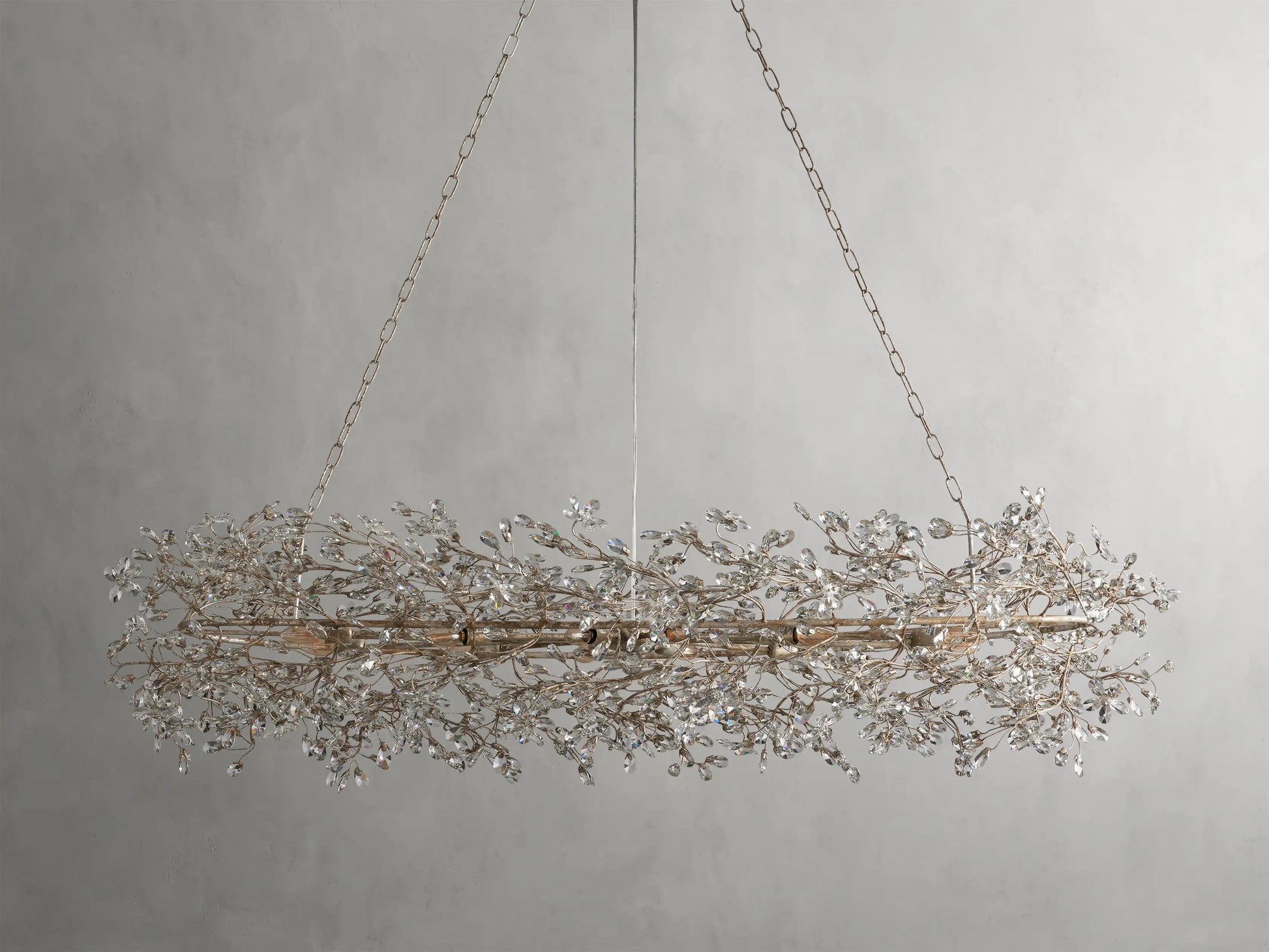 Inspired by the organic beauty of blooming branches, the Fiore Oval Chandelier features cascading crystal florals and droplets on a sculptural iron frame. Each piece is handcrafted and hand-finished in silver, gold, or bronze, reflecting the elegance of nature with artisan-level detail.