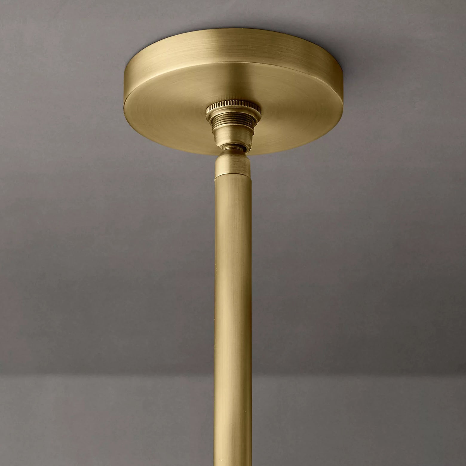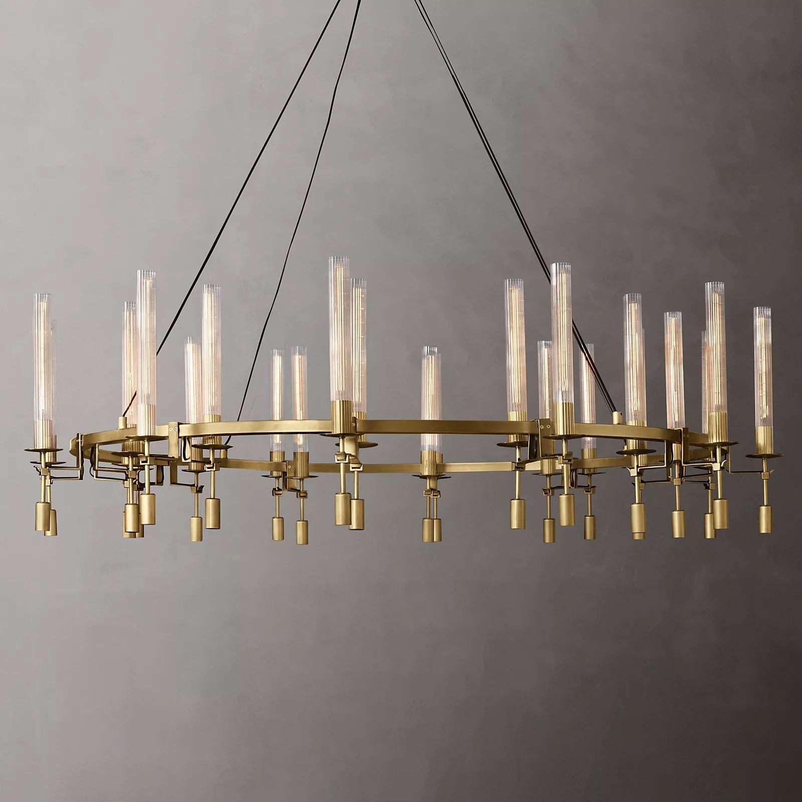 Crafted of solid brass, this fixture evokes 1940s French classicism. Its minimalist architecture features Edison bulbs set within cylinders of ribbed glass, shimmering like candles.