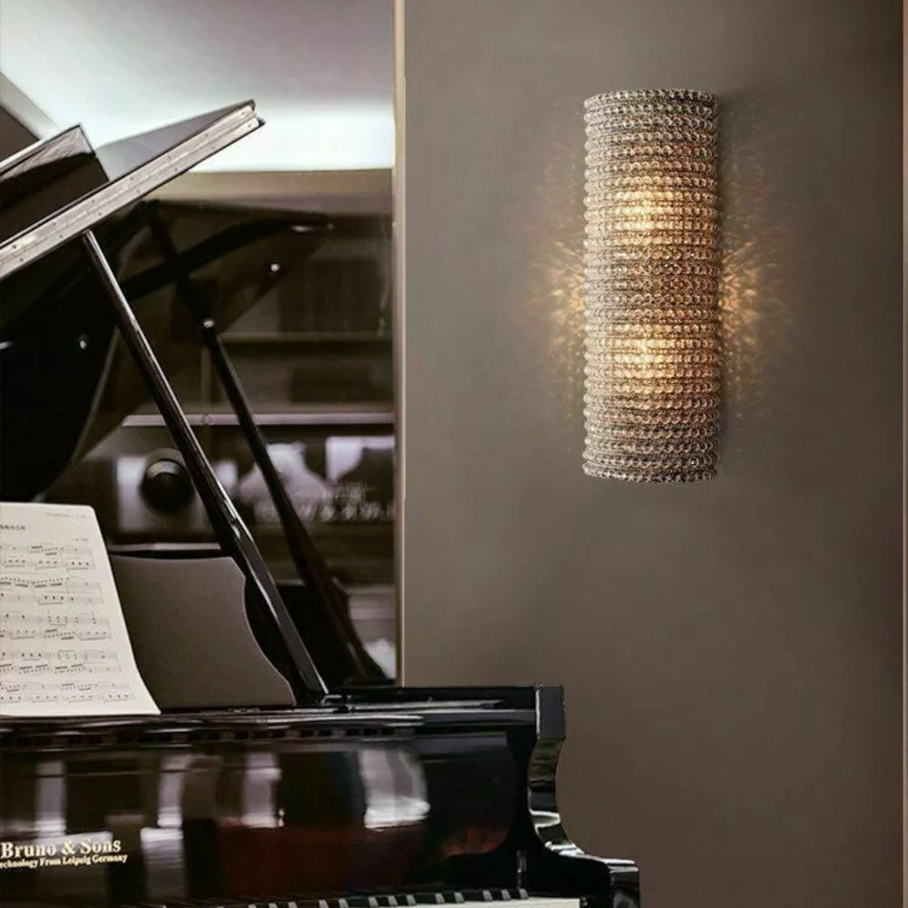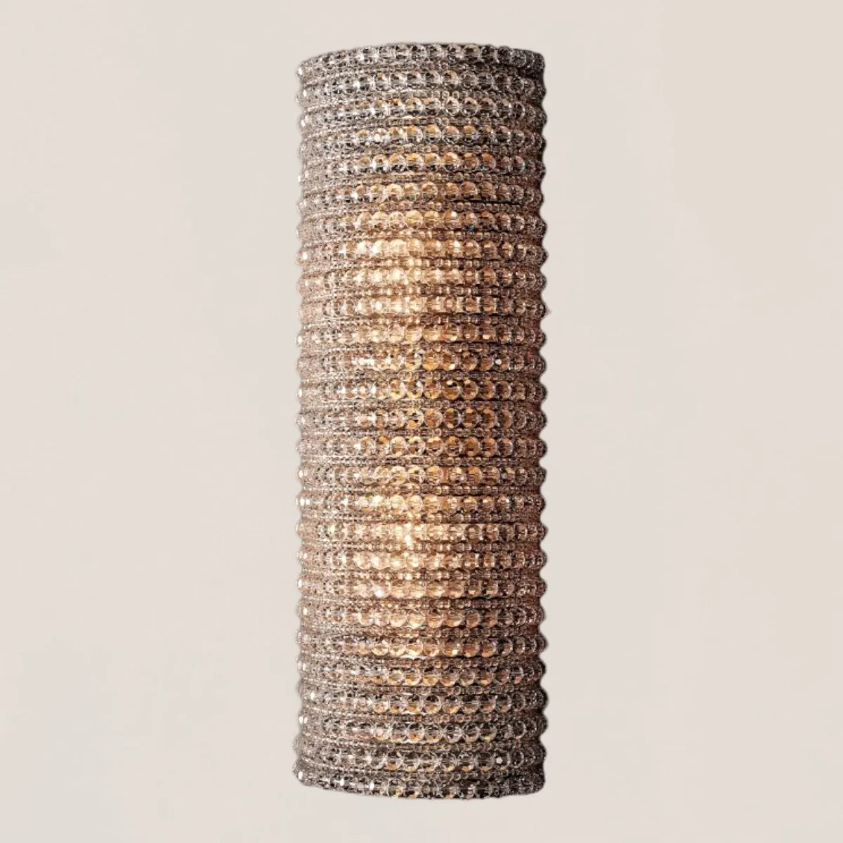 The collection of chandeliers/wall sconce, inspired by French antique designs, features thousands of faceted, hand-wrapped smoked crystal beads encasing a steel frame, forming a floating sphere suspended by steel cables. The beads filter and refract light, casting a soft, inviting glow.