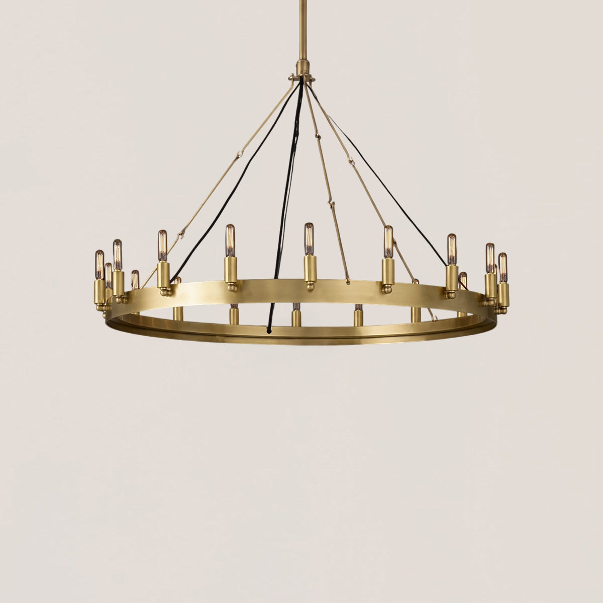 The Camino Vintage Filament Round Chandelier combines early 20th-century industrial style with contemporary elegance. Handcrafted from durable, hand-forged angle iron, this chandelier features a single circular frame supporting vintage-inspired filament bulbs. The sockets are wrapped in sheet metal, highlighting the fixture's industrial character and rustic charm.