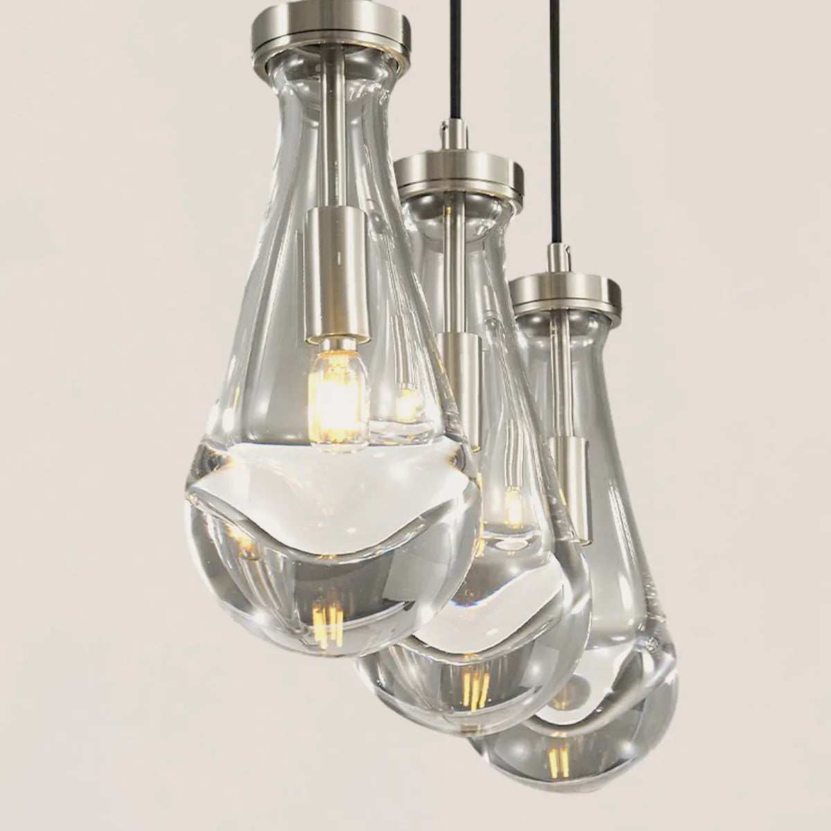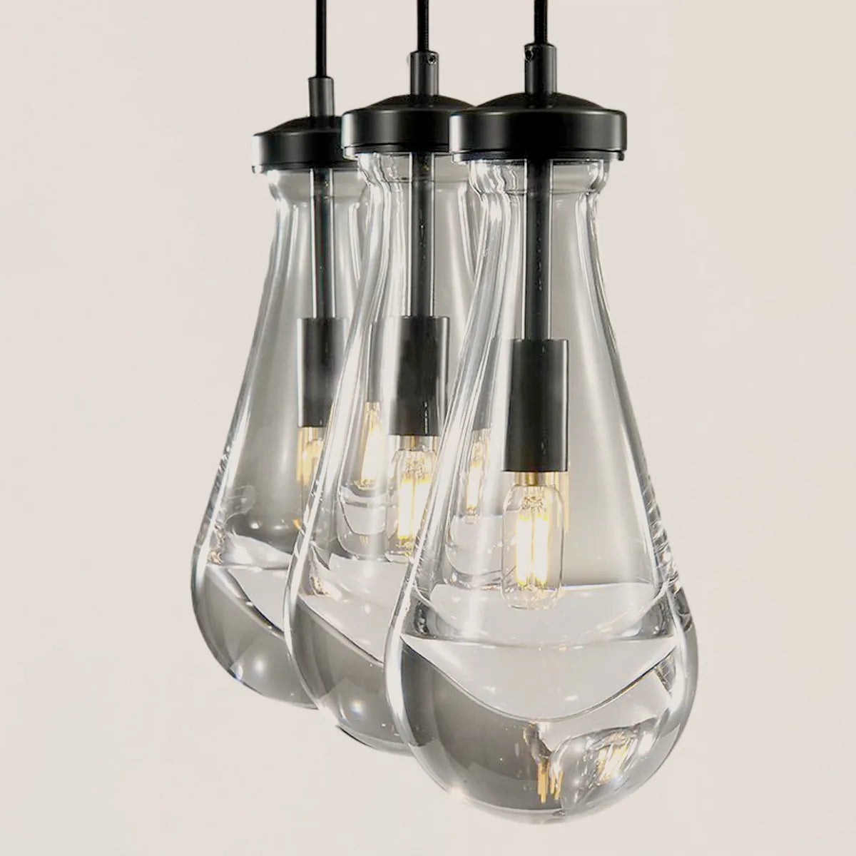 Much like the rhythm of a rainstorm itself. Suspended from slim black cords, drops of blown glass encase the bulbs - creating the illusion of underwater illumination - and cast luminous ripples that wash across ceilings and walls.