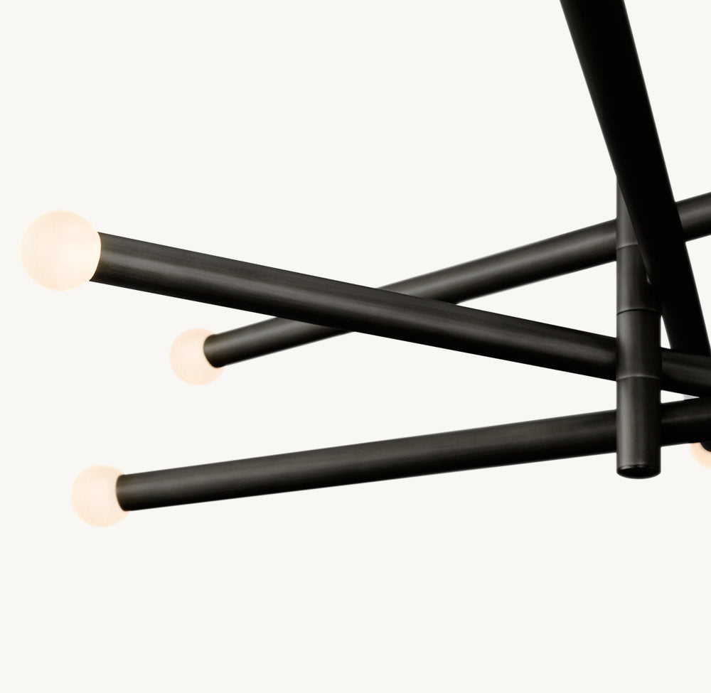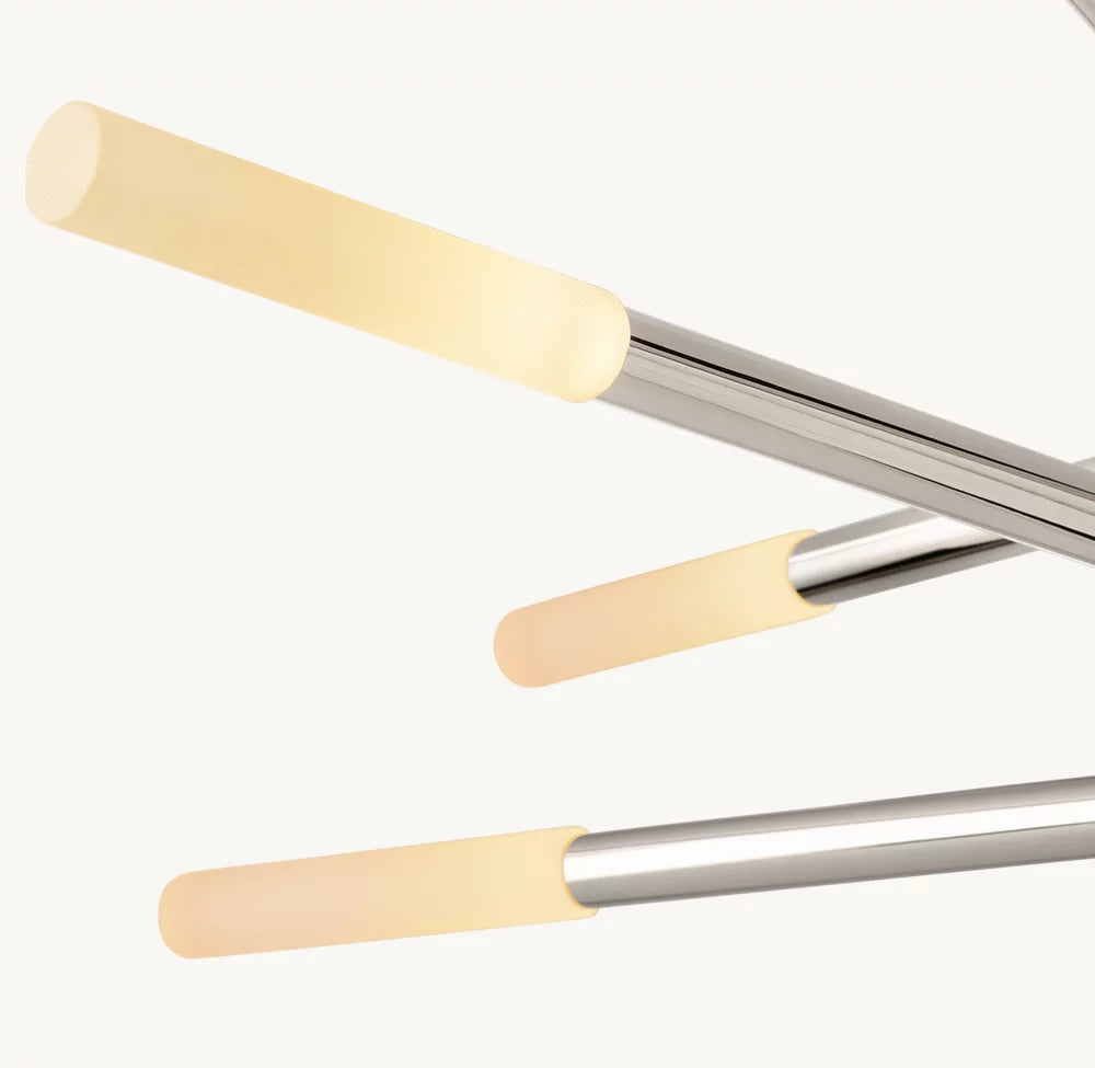 Inspired by minimalist midcentury Italian design, our contemporary interpretation of the chandelier offers reductionist form in a striking silhouette. Each end of Rousseau's slender arms bears an etched glass shade fitted with an integrated LED bulb. When lit, the fixture emits a warm, filtered glow.