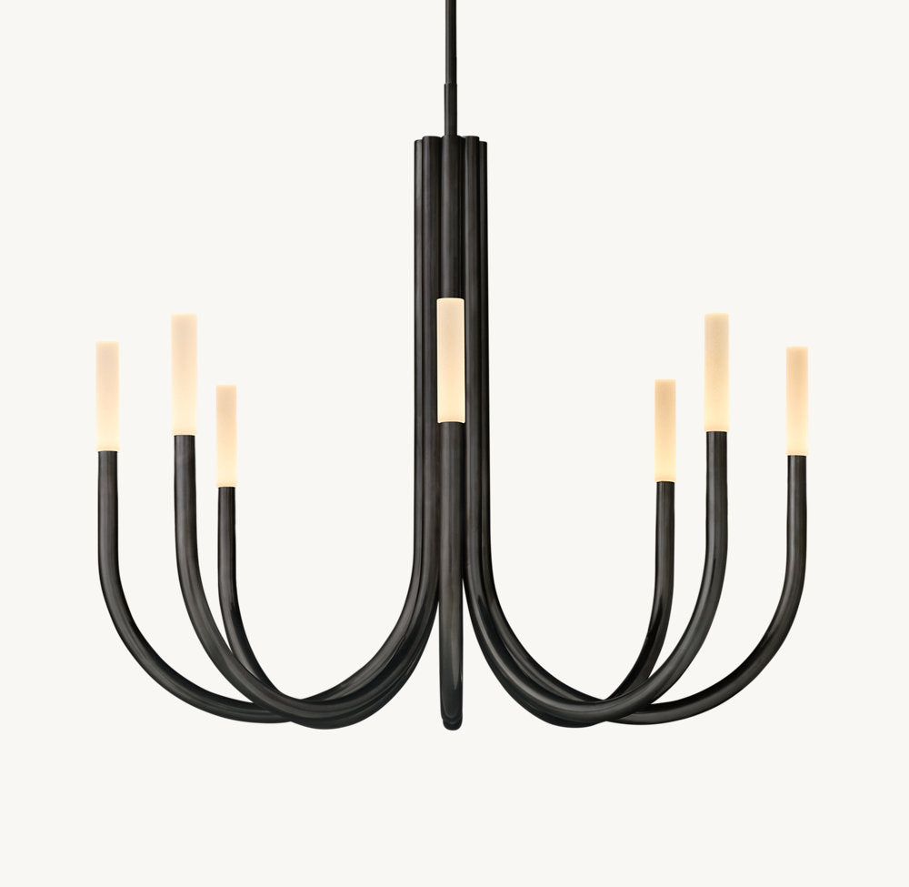 Inspired by minimalist midcentury Italian design, our contemporary interpretation of the chandelier offers reductionist form in a striking silhouette. Spare and understated, Rousseau's gracefully upraised arms hold aloft an etched glass shade fitted with an integrated LED bulb. When lit, the fixture emits a warm, filtered glow.