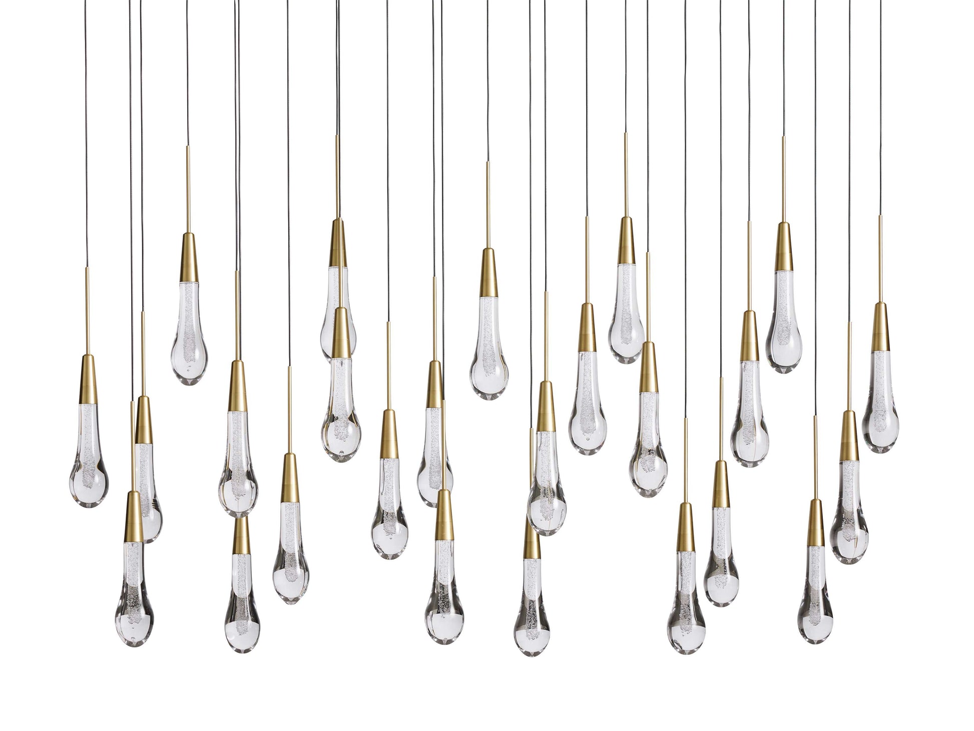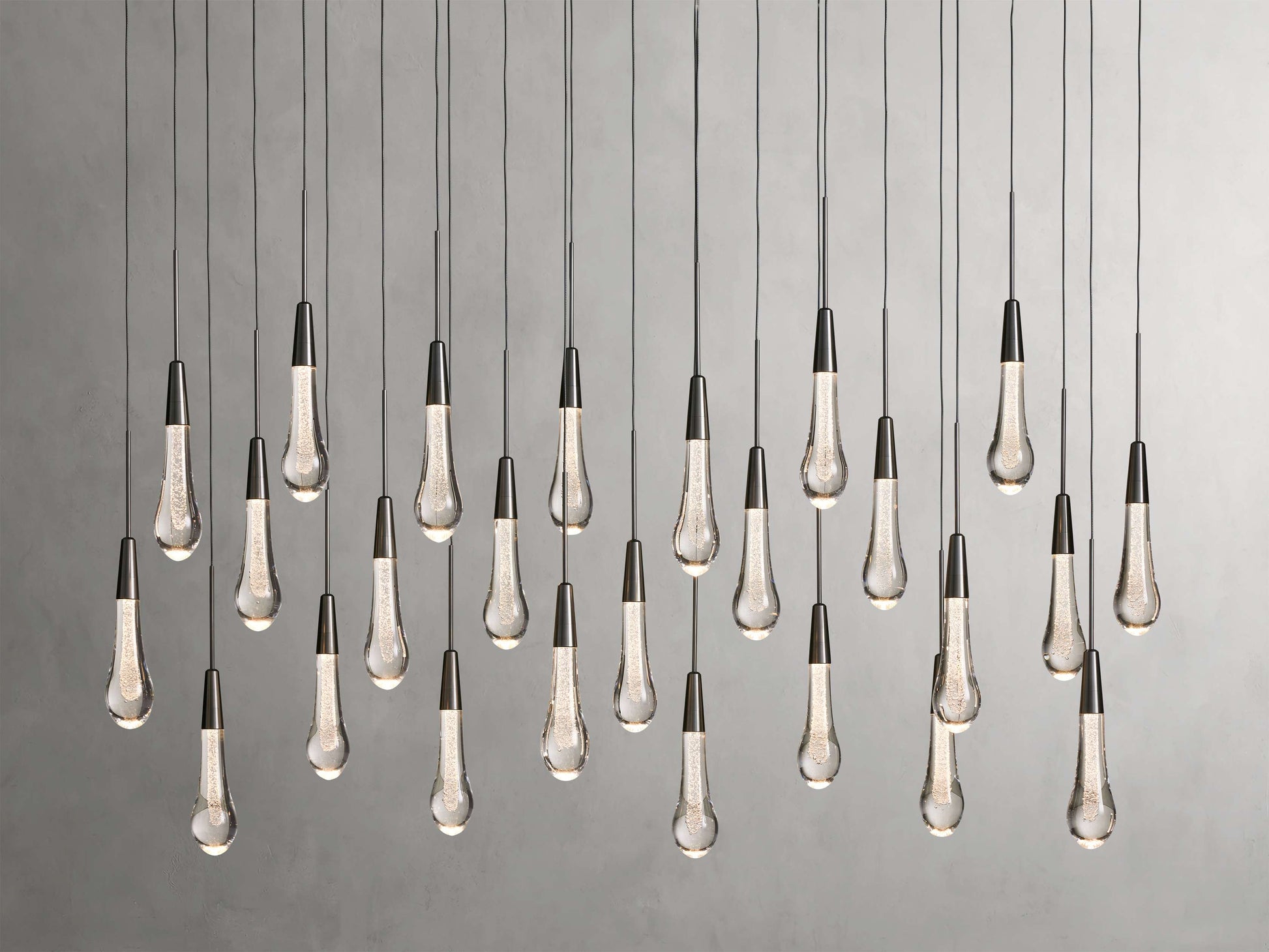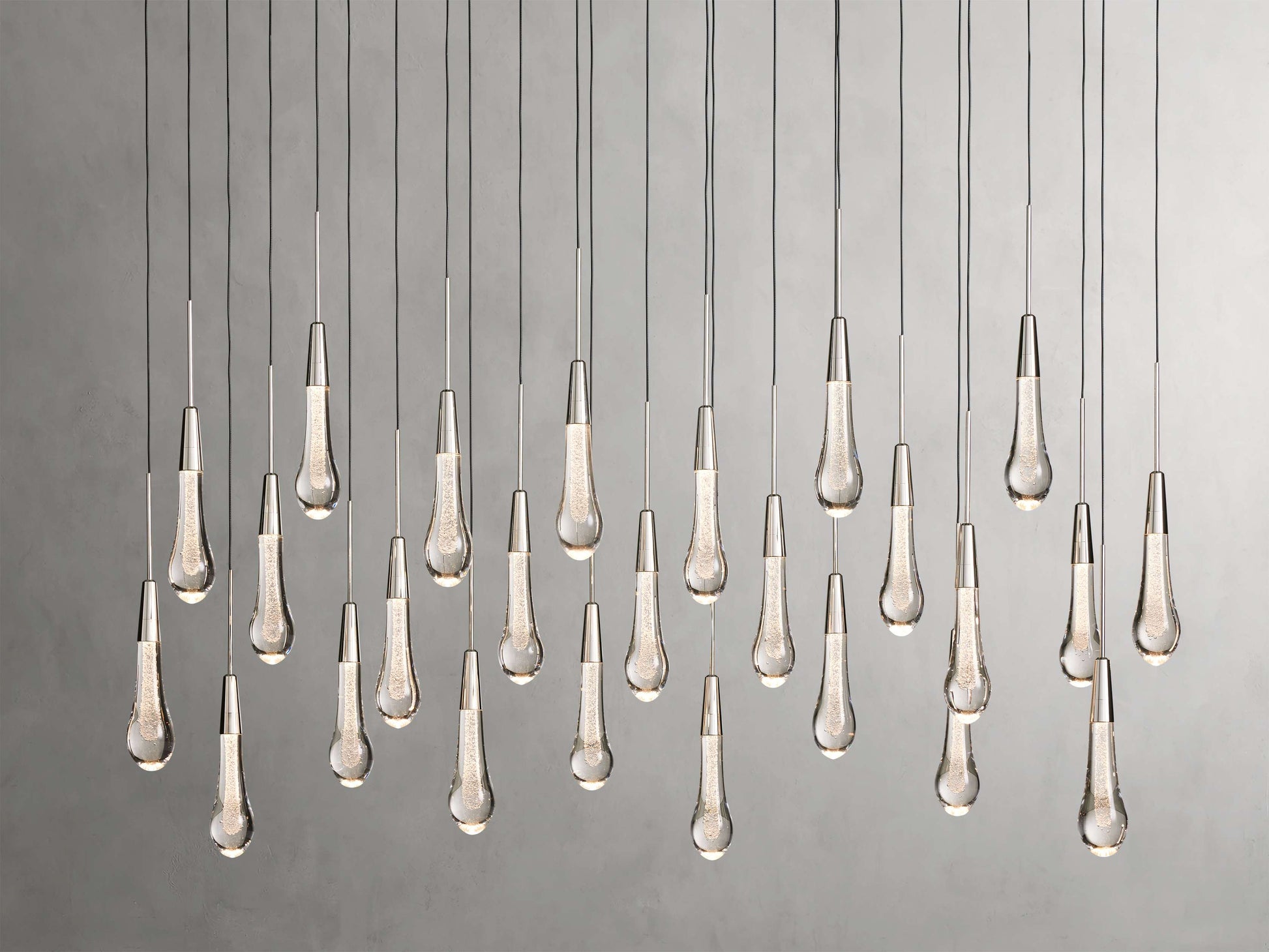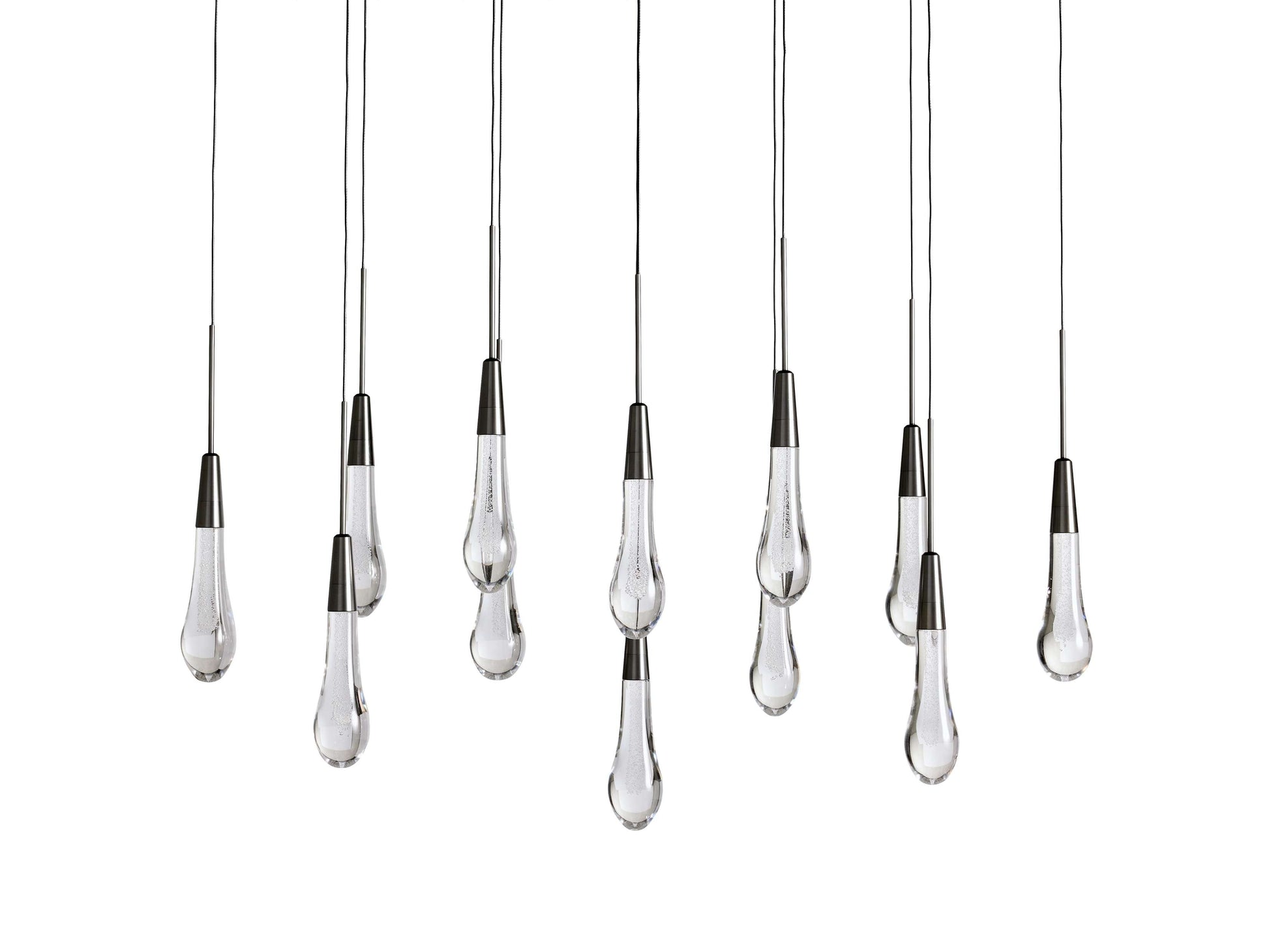 Featuring adjustable black PVC cords cascading into integrated LED lights handcrafted from seeded glass, our Soltaire Lighting Collection mimics the look of a fallen raindrop.