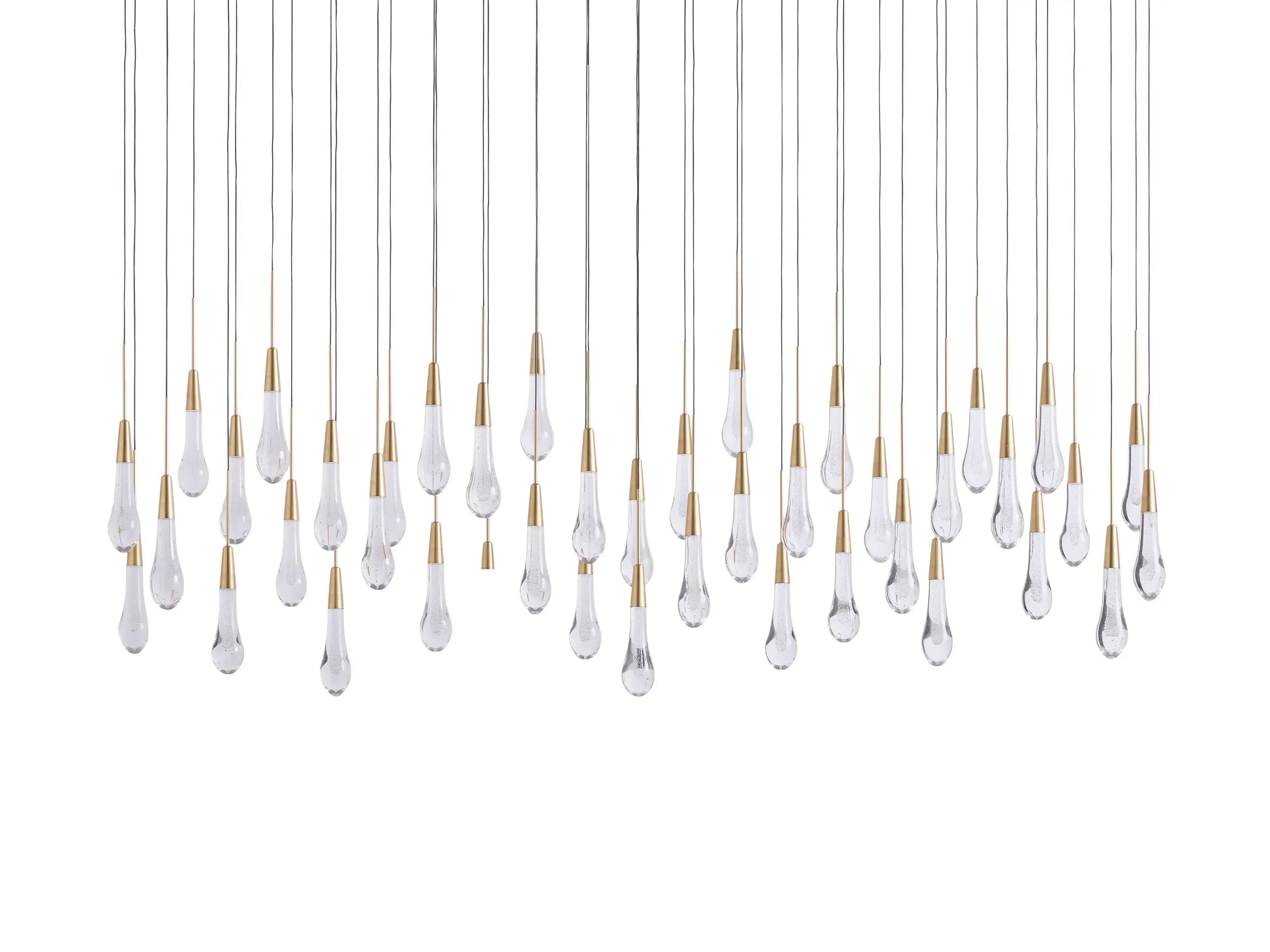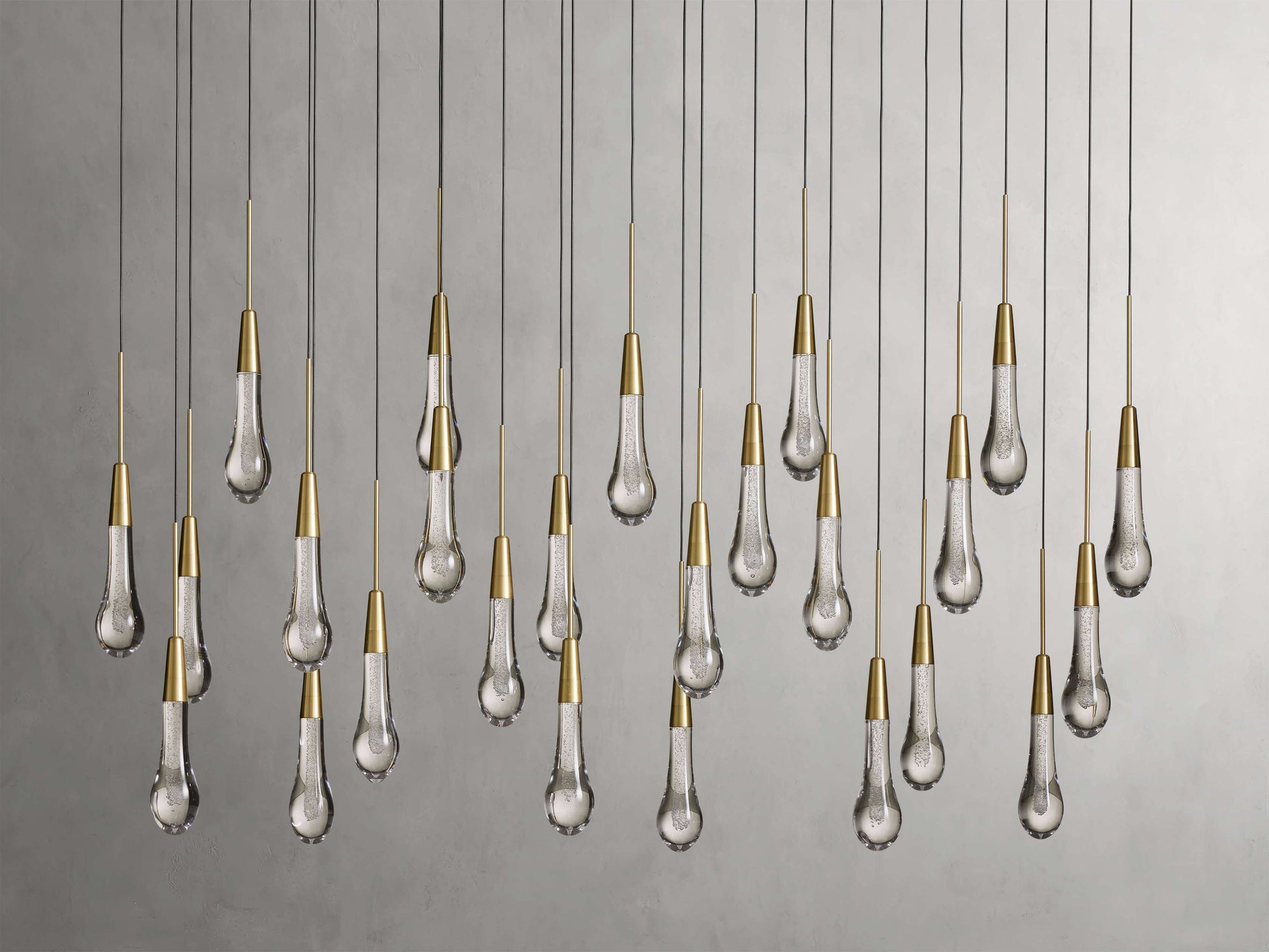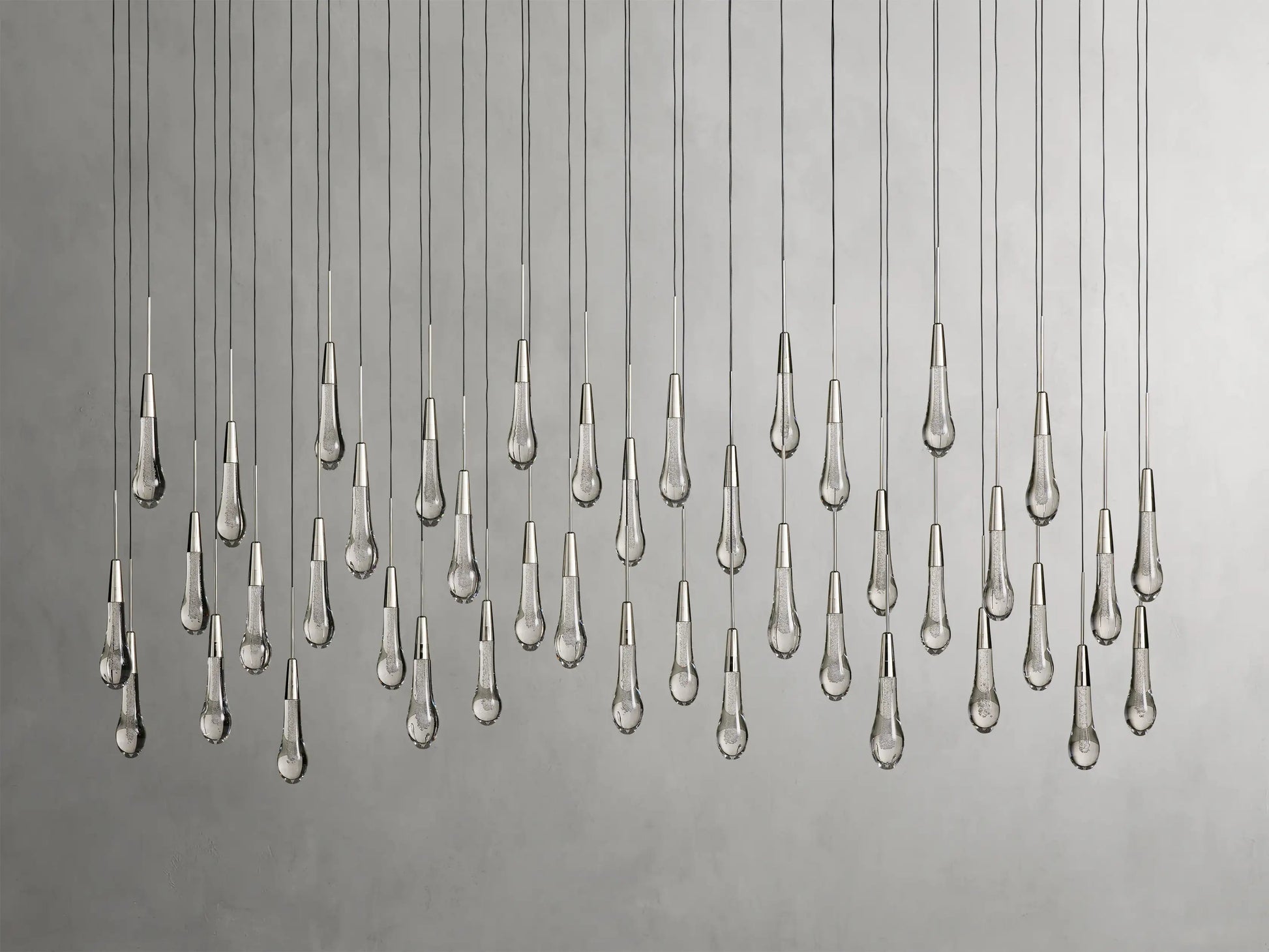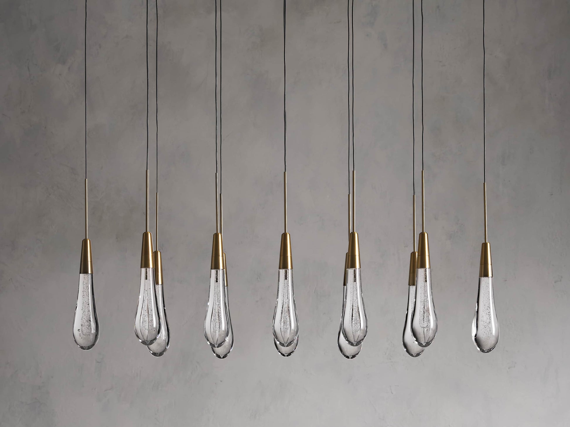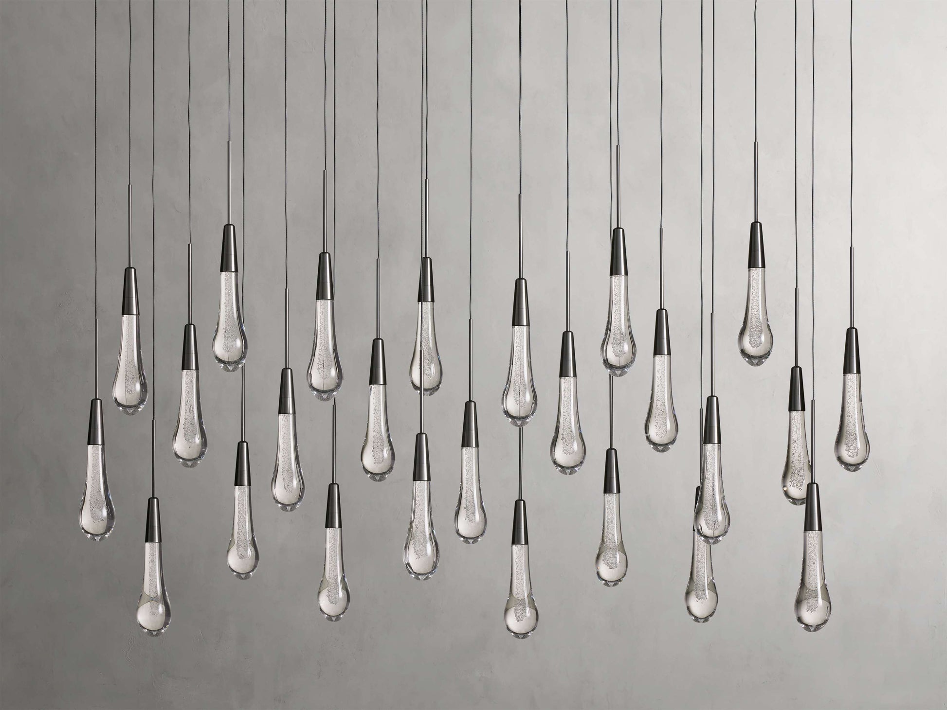 Featuring adjustable black PVC cords cascading into integrated LED lights handcrafted from seeded glass, our Soltaire Lighting Collection mimics the look of a fallen raindrop.