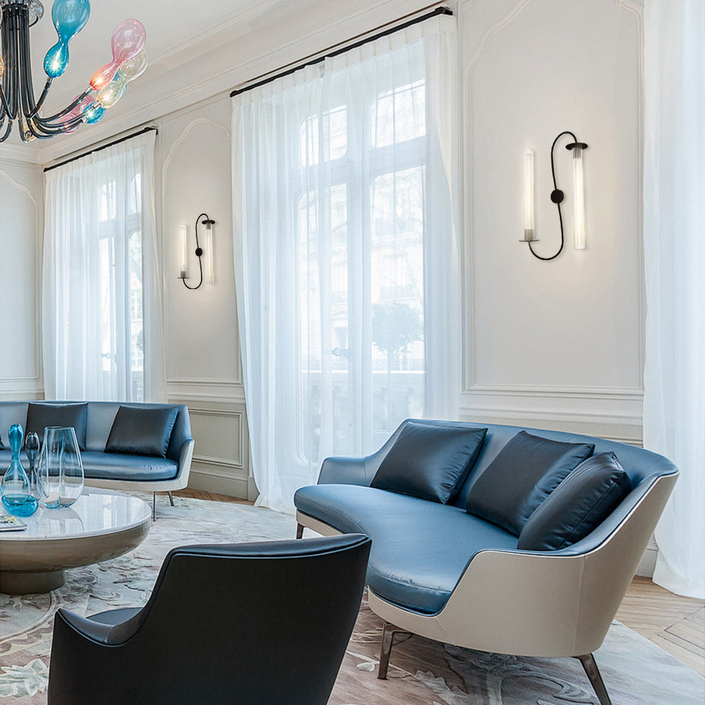 This wall sconce features a minimalist design with smooth lines and a symmetrical dual-arm structure for visual balance. Inspired by natural curves and modern geometric architecture, it blends curves and straight lines for a dynamic, harmonious look. Its clean, open design enhances the sense of space, making it ideal for modern interiors by adding both style and a sense of airiness.