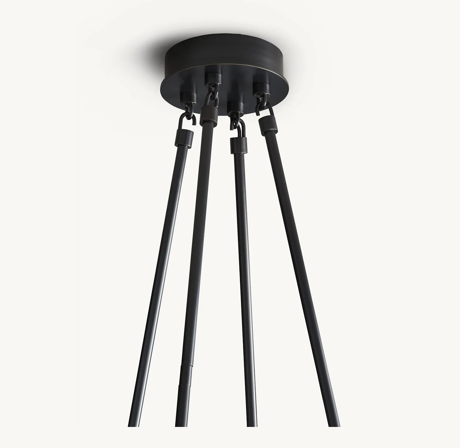 Available in Lacquered Burnished Brass or Matte Black finishes, the chandelier includes adjustable rods for customized installation heights on flat ceilings. Its timeless design complements dining areas, living rooms, and entryways, providing soft, sophisticated illumination.