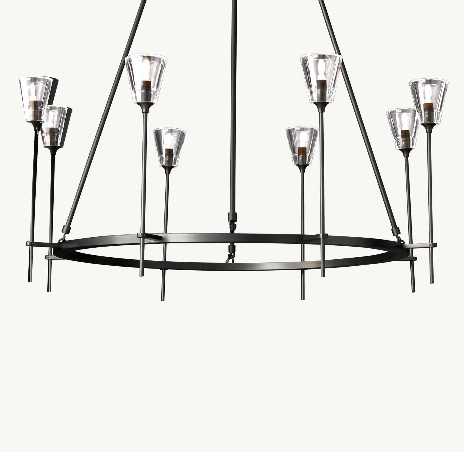 Inspired by French neoclassical torch designs, the Torche De Verre Round Chandelier brings refined elegance and contemporary style into your space. Designed by renowned lighting expert Jonathan Browning, this chandelier features a minimalist circular frame crafted from solid brass, paired with gracefully tapered clear glass shades.
