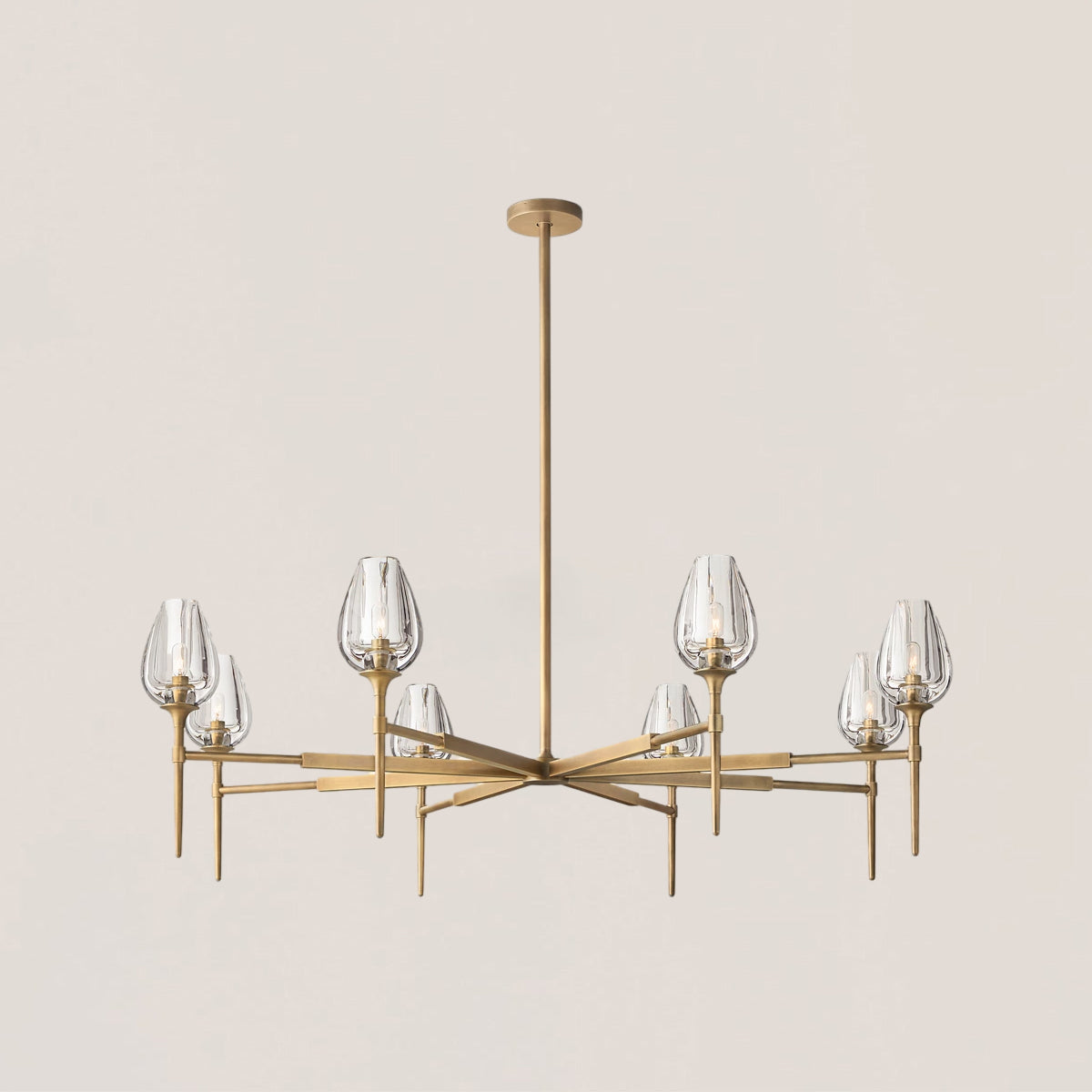 Drawing inspiration from the blossoming tulip, this collection showcases glass torchieres that have been meticulously carved from solid crystal blocks and meticulously polished by hand. The graduated thickness of the glass beautifully captures the gentle curves of a petal, while emitting a warm and inviting ambient light. The subtle brass armature elegantly holds the fluid forms, reminiscent of stems gently anchoring these fleeting flowers in space.